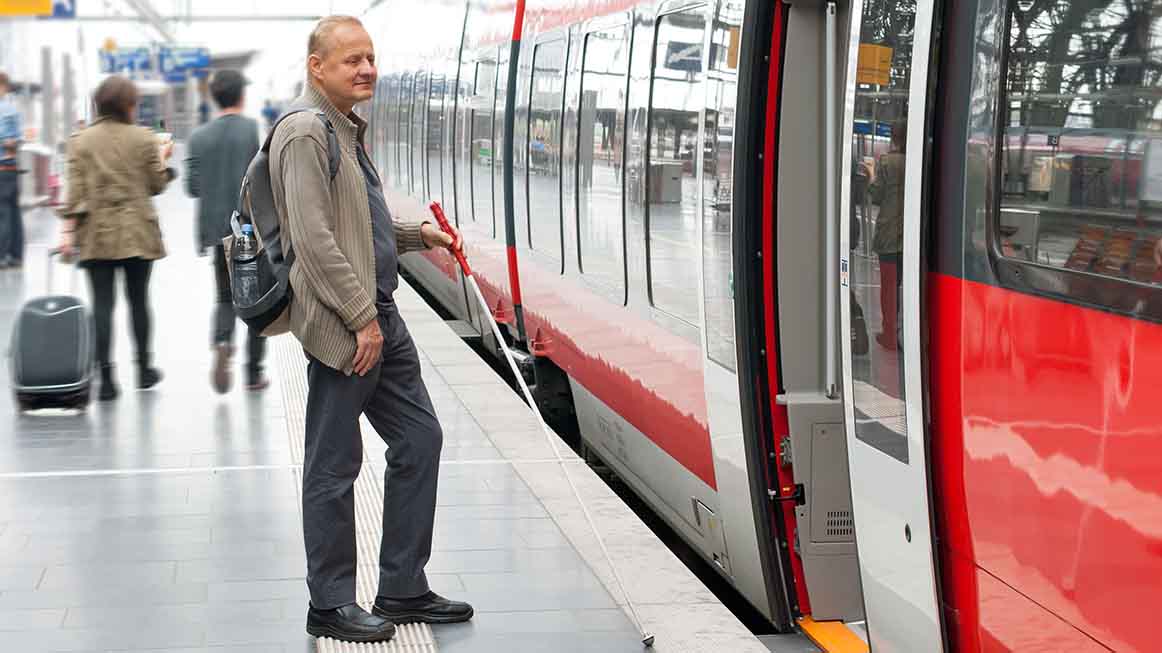 Blinder Mann steht auf einem Bahnhof an einem Zug mit offenen Tür.