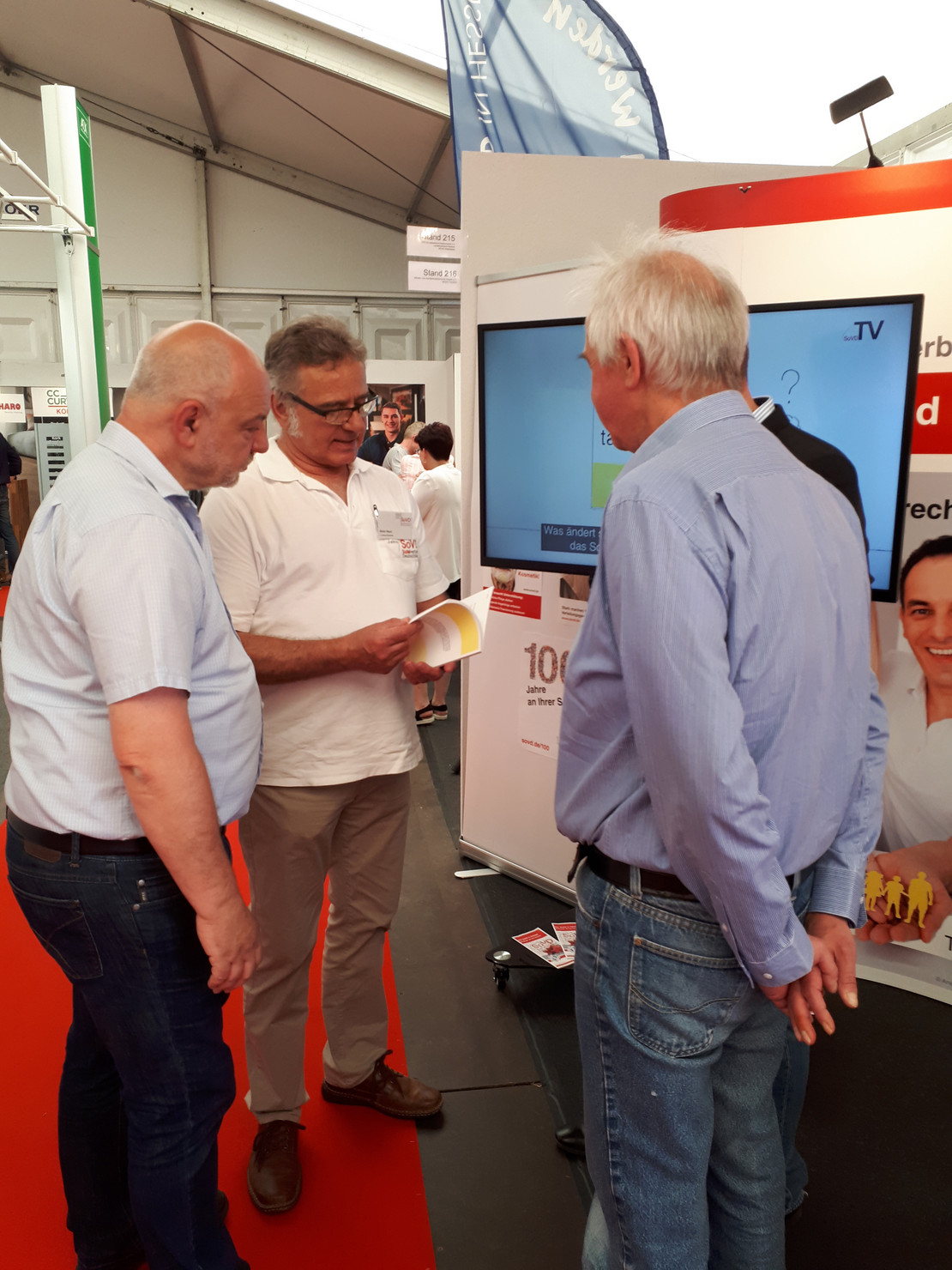 Auch in diesem Jahr fanden zahlreiche Besucher den Weg in die Halle 2 zum SoVD-Stand 215 auf dem Hessentag, der in diesem Jahr in Korbach stattfand. Der SoVD hatte seine prominente Standposition schräg gegenüber des Stands vom „Bundestag“ behaupten könnten. Dem SoVD gegenüber war die Deutsche Rentenversicherung mit ihrem Stand platziert, die „nicht immer zum Vergnügen“ ihrer Besucher deren Rentenanspruch errechnete. Im Anschluss daran konnten diese sich gleich am SoVD-Stand beraten lassen.