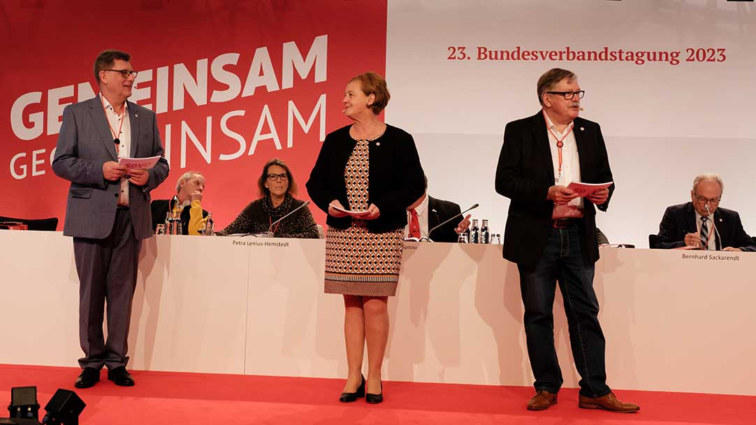Zunächst wurden die schriftlich vorliegenden Berichte über die zurückliegenden vier Jahre in Auszügen zur weiterführenden Information der Delegierten vorgetragen. Auf dem Podium präsentierten zunächst SoVD-Präsident Alfred Bornhalm, SoVD-Vorstandsvorsitzende Michaela Engelmeier und Bundesgeschäftsführer Michael Meder gemeinsam die zentralen Inhalte aus ihren jeweiligen Verantwortungsbereichen.