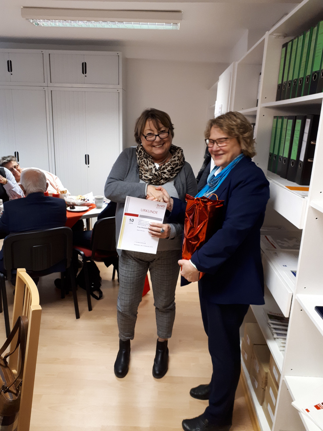 Im Rahmen dieser Veranstaltung konnte Roswitha Löw für ihre 10-jährige Mitgliedschaft im SoVD OV Wiesbaden geehrt werden. Sie ist zudem seit 10 Jahren als „Putzfee“ in der Landesgeschäftsstelle angestellt.