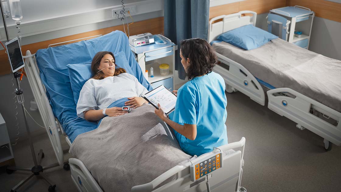 Eine Frau liegt in einem Krankenhausbett und spricht mit einer Pflegekraft.