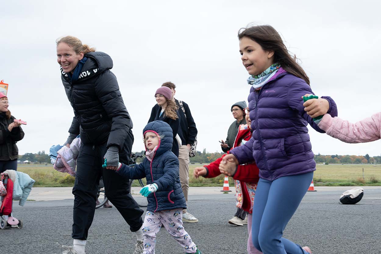 Um 13 Uhr schickte Schirmherr Fabian Drescher dann die letzten Teilnehmenden zu Fuß, im Rollstuhl, im Handbike und teils auch mit Guide oder Begleithund auf die große Runde rings um das Tempelhofer Feld, um die 5- oder 10-Kilometer-Strecke zu absolvieren. Anfangs trug der Rückenwind die Startenden über die Strecke, doch bei einem Rundkurs kommt unweigerlich der Punkt, an dem der Rückenwind zum Gegenwind wird. So gestalteten sich die letzten Kilometer etwas beschwerlicher, und der Wind forderte bei manchem Tribut. Doch je näher man dem Ziel kam, desto größer war die Motivation, die Ziellinie zu erreichen. Am Ende schafften alle die Etappe und konnten sich über die Finisher-Medaille und die wohlverdiente Stärkung mit Obst, Wasser und Traubenzucker freuen.