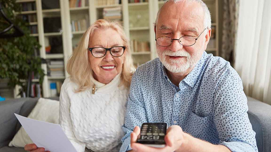 Älteres Paar mit Taschenrechner und Papier auf dem Sofa