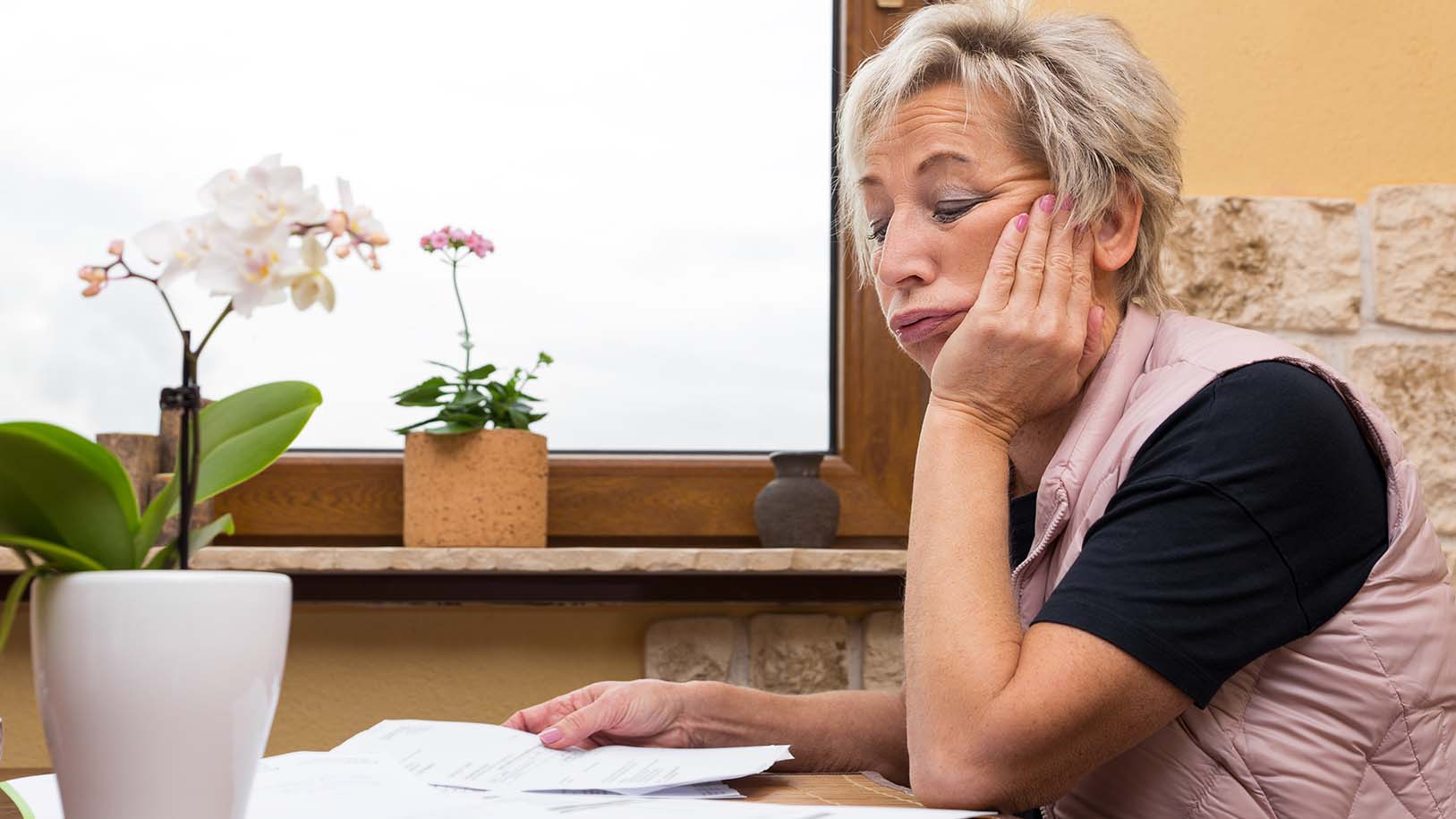 Erschöpfte Frau sitzt mit Unterlagen an einem Tisch