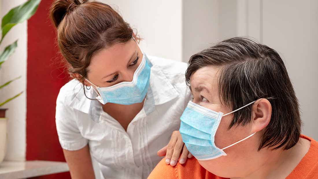 Frau mit Maske legt älterer Frau mit Behinderung Hand auf die Schulter.