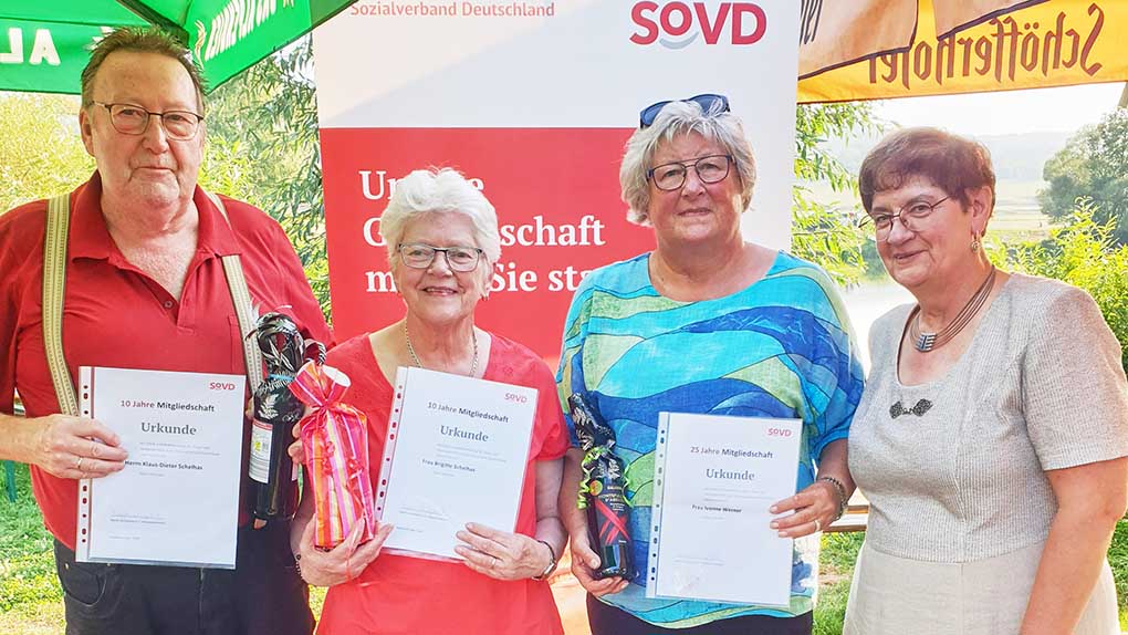 Vorsitzende Marita Schliephorst, zugleich Landesschatzmeisterin und Vorsitzende des Kreisverbandes Osthessen, ehrte Ivonne Werner für ihre 25-jährige Mitgliedschaft sowie das Ehepaar Brigitte und Klaus-Dieter Schelhas für ihre zehnjährige Mitgliedschaft im SoVD. Neben ihren Urkunden und Abzeichen erhielten sie auch ein kleines Präsent. Die weiteren, in Abwesenheit geehrten Mitglieder bekamen ihre Urkunden und Abzeichen nachgereicht.