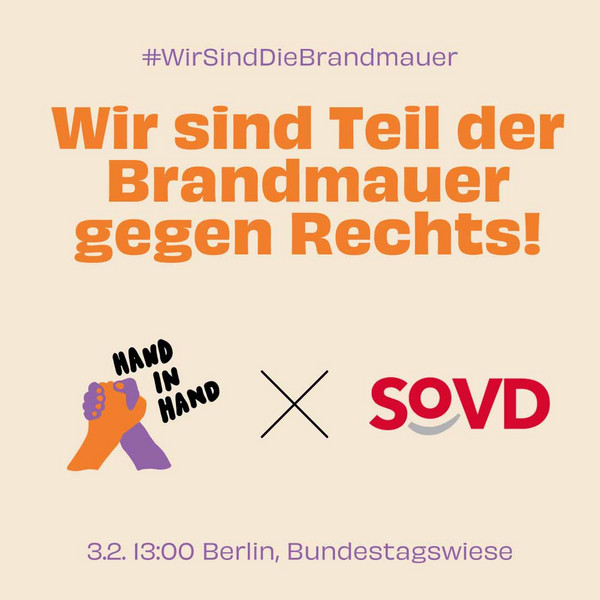 Am Samstag, den 3. Februar ist unter dem Motto „#WirSindDieBrandmauer" eine symbolträchtige Aktion auf der Bundestagswiese geplant in Berlin, an der sich auch der SoVD beteiligt. Mit einer Brandmauer gegen Rechtsextremismus setzt sich ein breites zivilgesellschaftliches Bündnis ein für Solidarität und Respekt, gegen Hass und Hetze, für Gerechtigkeit und Toleranz, gegen Spaltung, für eine Gesellschaft, die niemanden zurücklässt, für Menschenwürde, gegen Ausgrenzung.