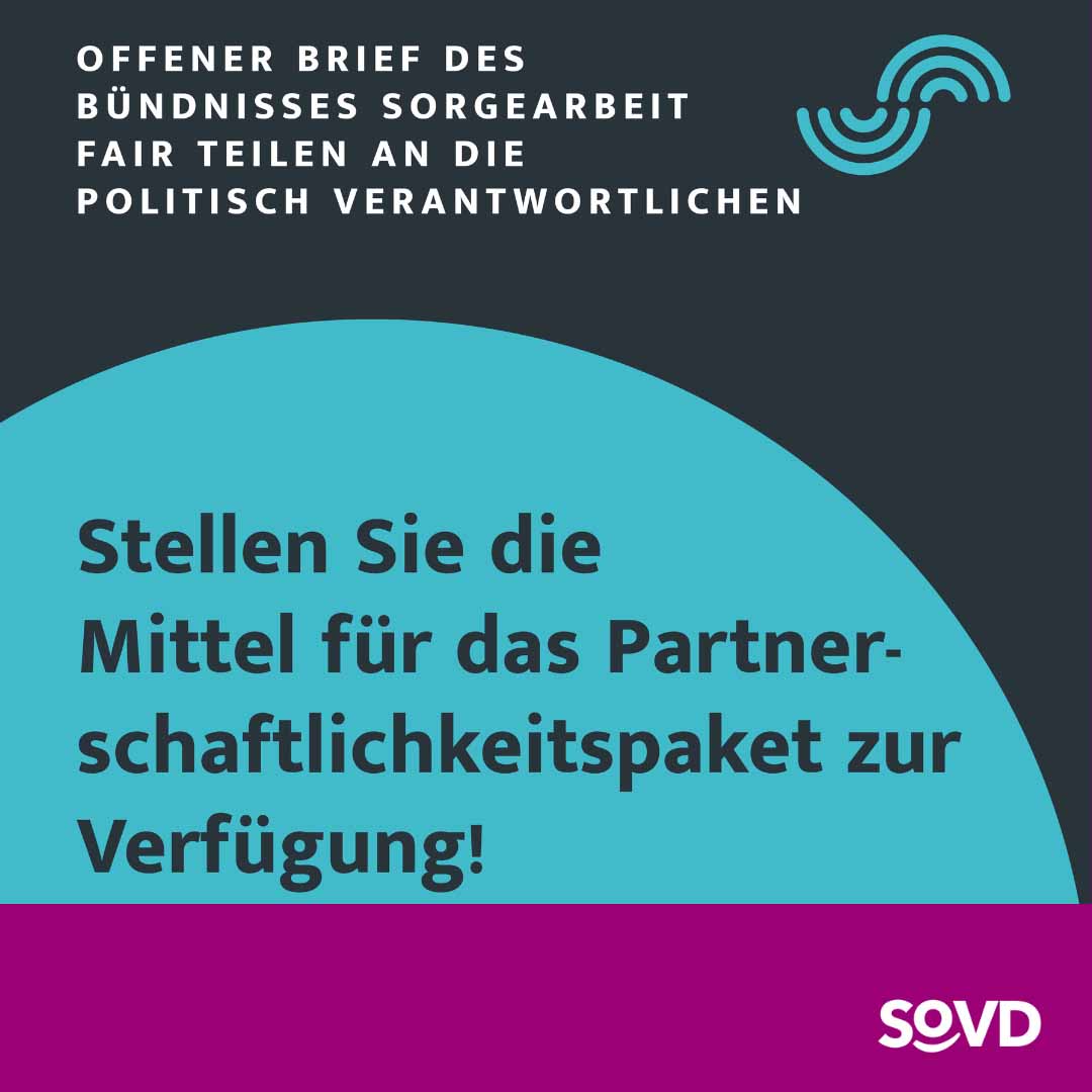 Heute, ein Jahr später, ist zu keinem dieser Projekte ein Gesetzgebungsverfahren gestartet. Das Bündnis „Sorgearbeit fair verteilen“, an dem auch der SoVD beteiligt ist, mahnt die Verantwortlichen in der Politk deshalb, die Themen endlich mit Dringlichkeit anzugehen.