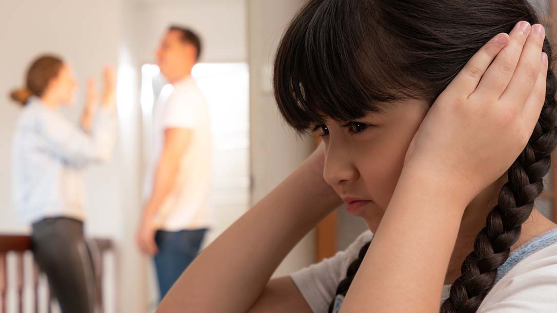 Kind hält sich die Ohren zu, während im Hintergrund seine Elten streiten.