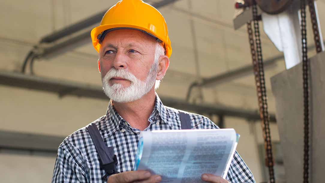 Älterer Mann arbeitet in einer Fabrik an einer Maschine.