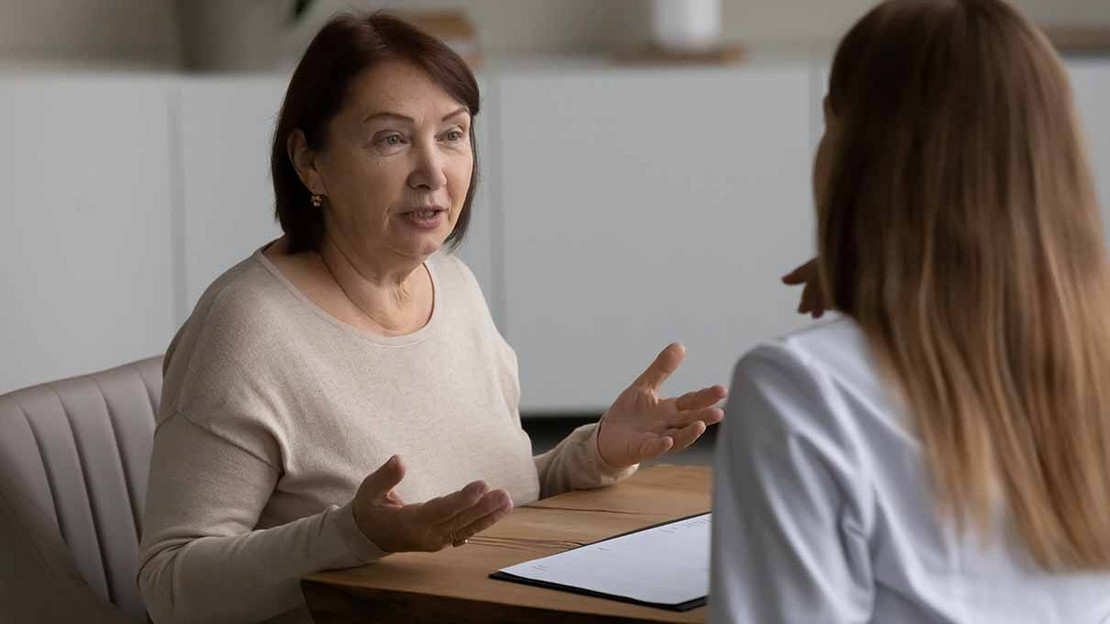 Frau liest mit besorgtem Gesicht einen Zettel.