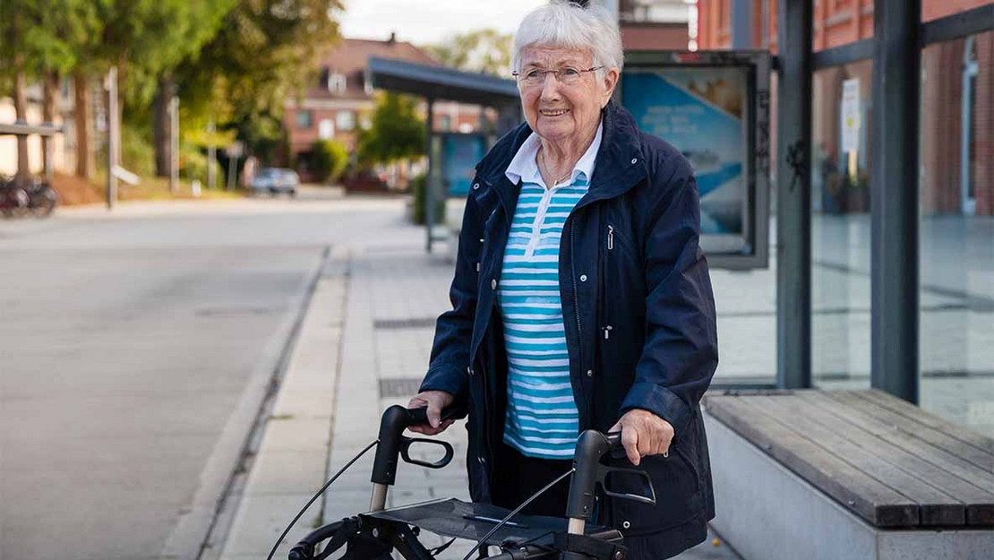 Ältere Dame erhält von Pflegerin Hilfe.