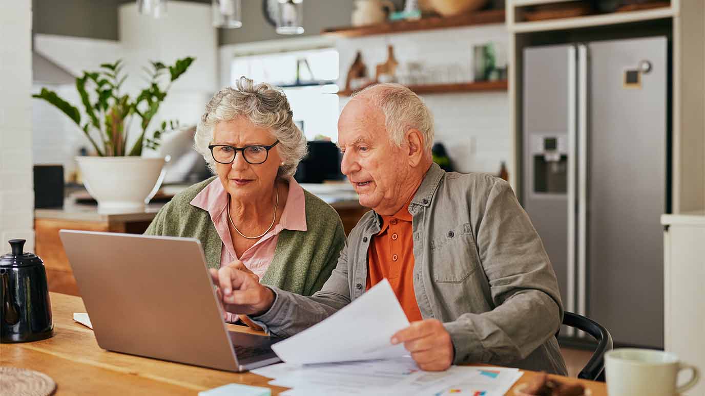 Ein Rentnerpaar sitzt mit Laptop und Unterlagen in der Küche.